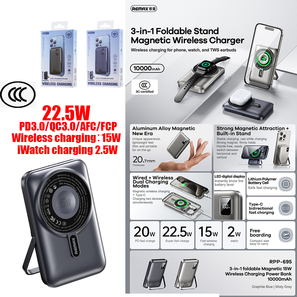 | ថ្មជំនួយ សាកលឿនឥតខ្សែ ម៉ាញេទិក Remax RPP-695 CCC 10000មីលីអំពែ |