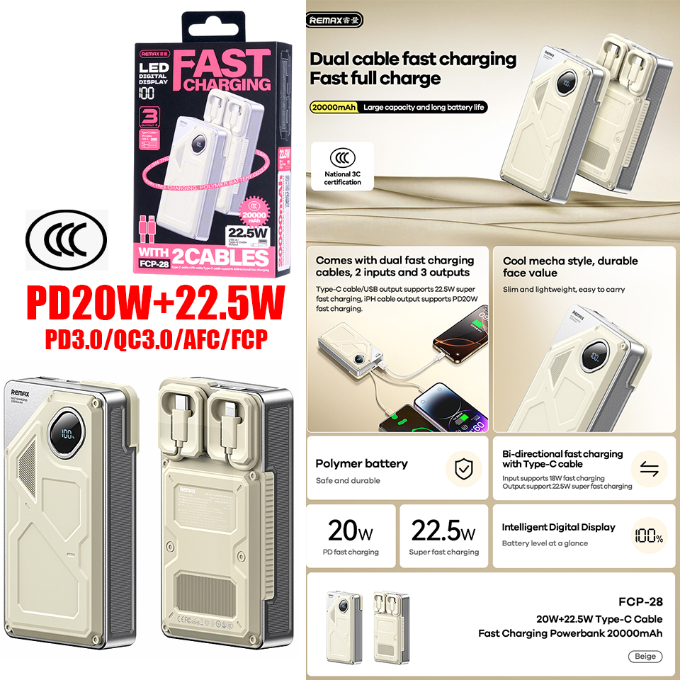 | ថ្មជំនួយ Remax FCP-28 20W+22.5W(PD/QC)20000 មីលីអំពែ CCC |